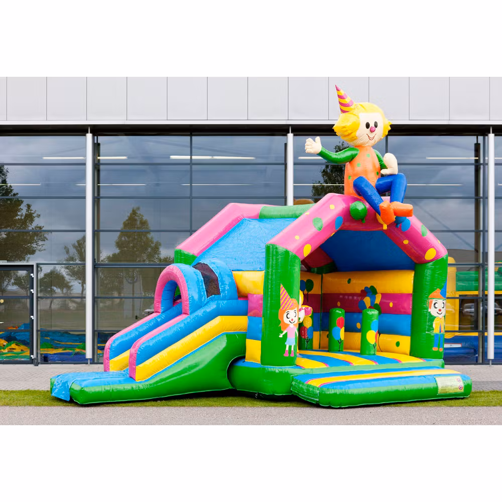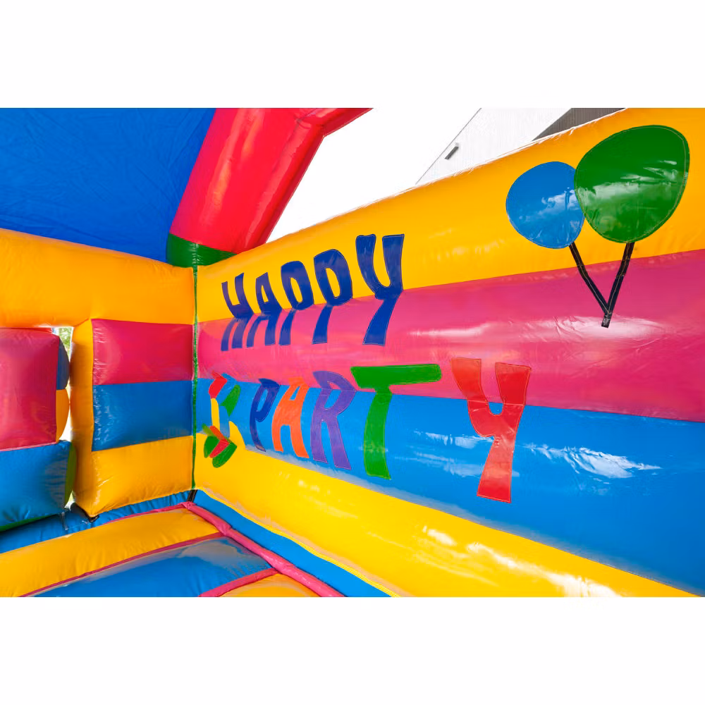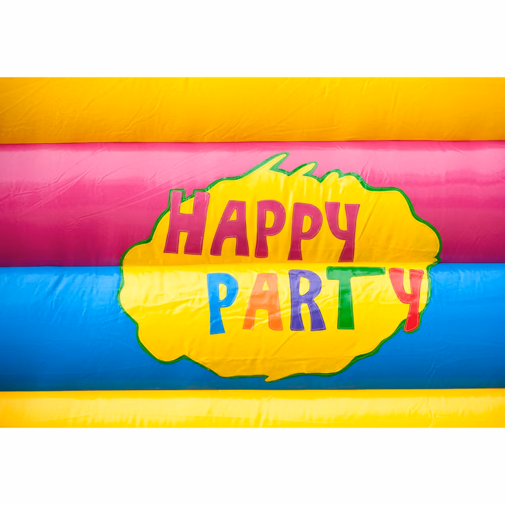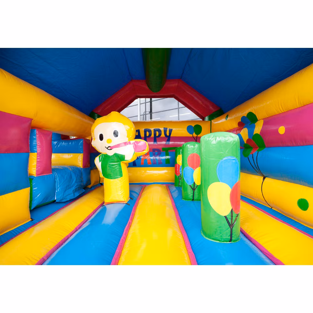 Ge barnen en unik upplevelse med denna mångsidiga hoppborg med födelsedagskalas tema. Hoppborgen kommer med olika hinder och en rutschkana. Barnen kan klättra längs med eller över föremålen, pelarna är utrustade med vackra färgtryck som är specialdesignade. Hoppborgen har också en iögonfallande 3D-figur på taket. Dessutom kan du glida ner via rutschkanan på sidan av hoppborgen för extra kul! Både små och äldre barn kan ha kul i denna festliga hoppborg. En rolig upplevelse för alla.