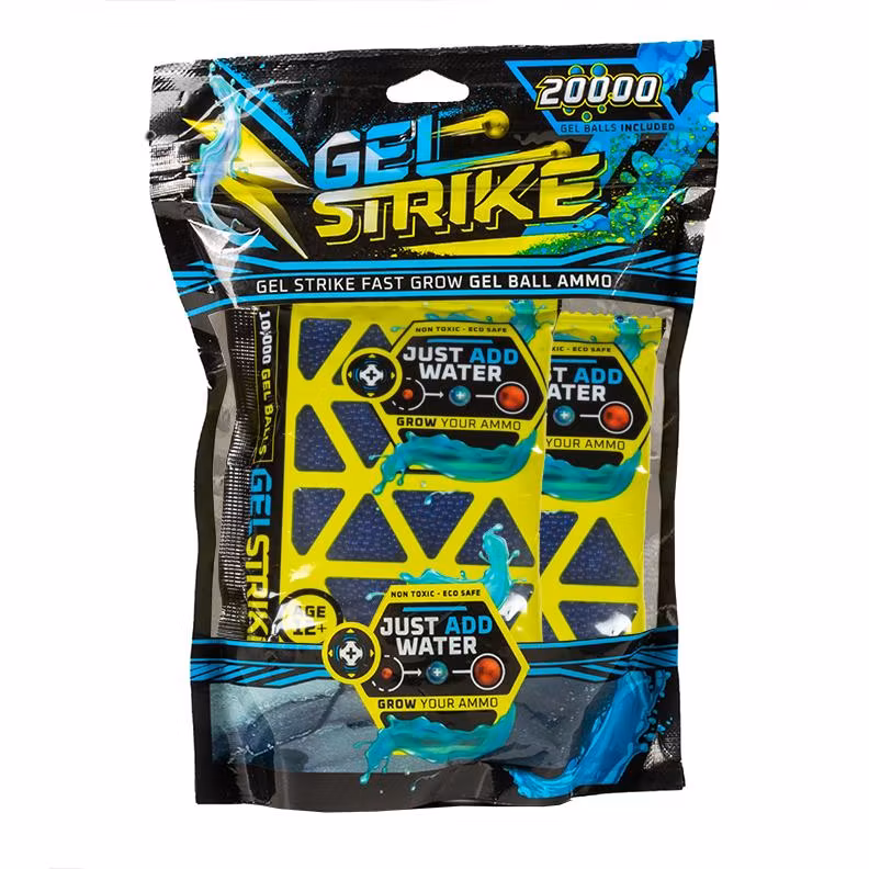 Gel Strike's egna Gel Balls, gelékulor som du bara tillsätter vatten till, så växer de till full storlek efter några timmar och kan skjutas med Gel Strike Rapid Blasters.