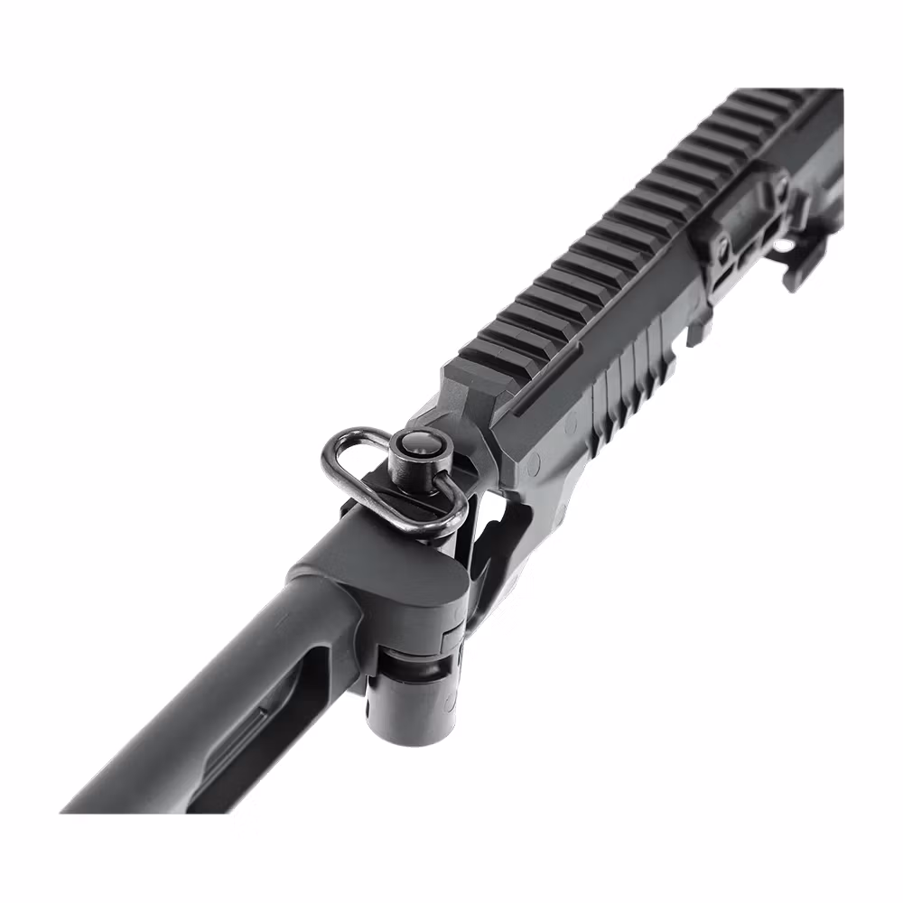 En lång Picatinny-toppskena möjliggör montering av optiska system, och ytterligare M-LOK-slitsar säkerställer kompatibilitet med standardtillbehör som bipoder, lasrar och lampor. Det finns tre Quick Detach (QD)-gränssnitt för remmar och annan utrustning.