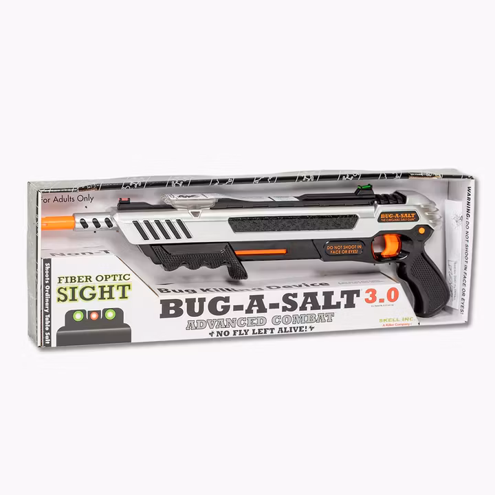 Trött på irriterande flugor? Gör dig redo att ta tillbaka ditt hem – med stil! Bug-A-Salt Black Fly 3.0 är det roligaste och mest tillfredsställande sättet att bli av med flugor på bara sekunder. Ladda med vanligt bordssalt, pumpa handtaget – och sikta. POW! Flugfritt på nolltid.