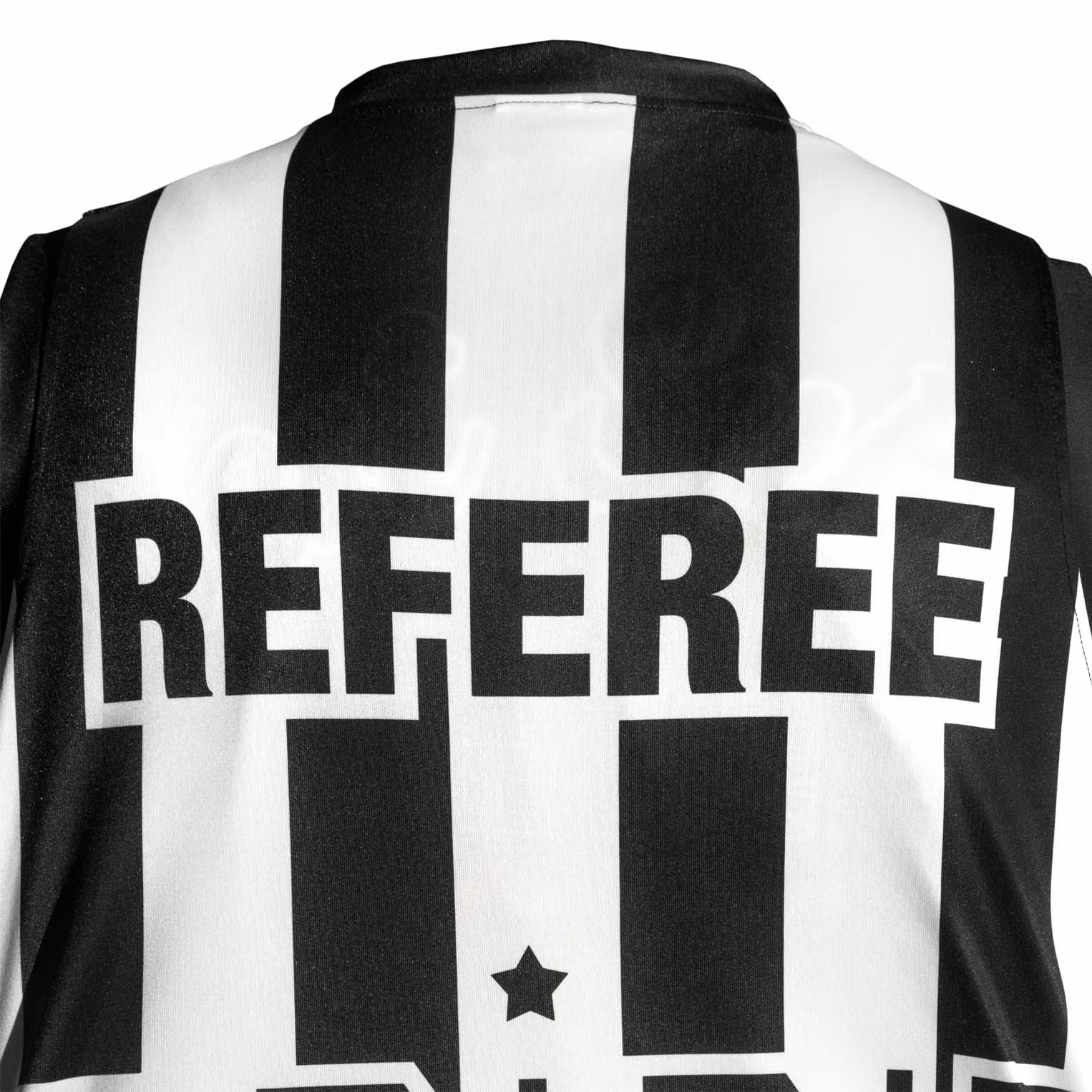 Svarta och vita ränder + stora ord REF / REFEREE för omedelbar igenkänning av domaren eller monitorn.