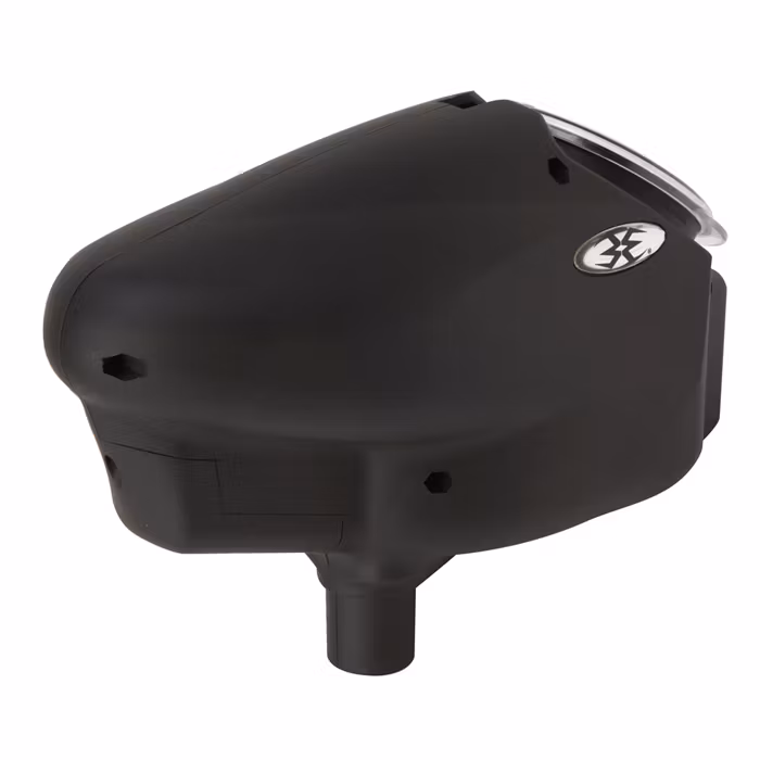 Det nya, mattsvarta polykarbonatskalet tål alla slag och får enkelt plats med 180 paintballs. Den inbyggda datorn styr den ljudaktiverade matningen och låter dig programmera motorhastighet, mikrofonkänslighet och övervakning av matningsstack. Men naturligtvis, med ett namn som Halo, visste du att du skulle få det ultimata inom paintball-magasin.